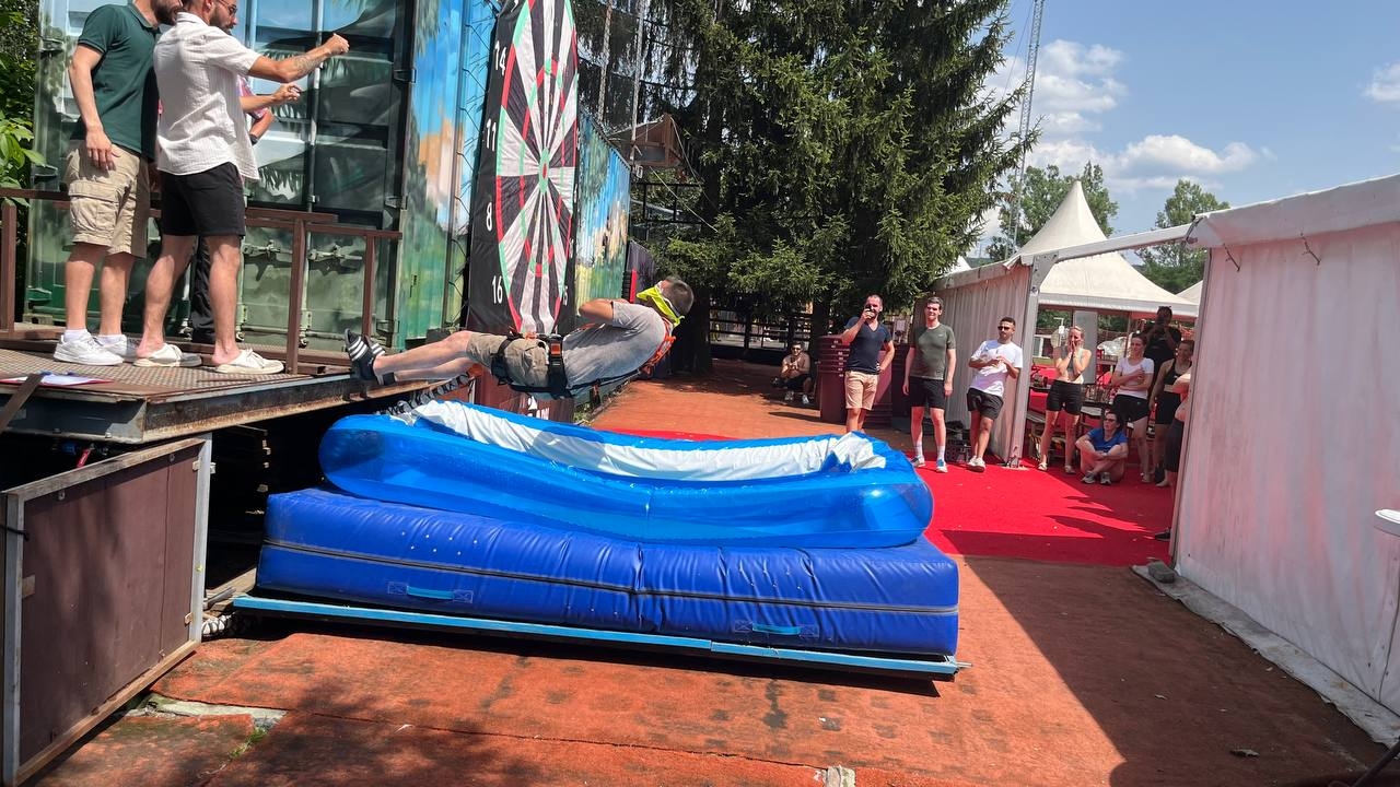 Vous l’encouragez, criez son nom, l’ambiance est à son comble. Après plusieurs hésitations… il saute enfin, et là – PLAF ! Il tombe dans une petite piscine glacée, ventre en avant. Hilarant, cruel… et absolument parfait.